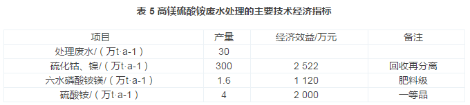 項(xiàng)目設(shè)計(jì)年處理30萬t高鎂硫酸銨廢水,年回收300 t硫化鎳鈷、1.6萬t磷酸銨鎂及4萬t硫酸銨產(chǎn)品,年利潤(rùn)達(dá)600萬元以上,并達(dá)到了節(jié)水、節(jié)能、資源綜合利用的社會(huì)效益,其主要技術(shù)經(jīng)濟(jì)指標(biāo)如表 5所示。