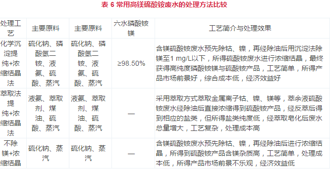 對(duì)目前常用的高鎂硫酸銨廢水處理方法進(jìn)行比較,如表 6所示。