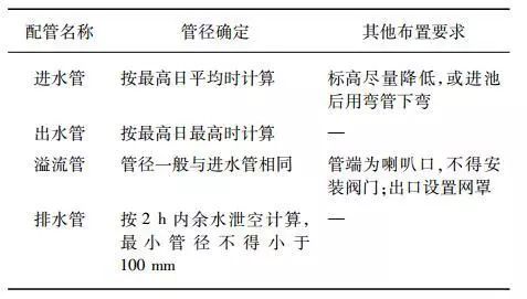 1、調(diào)蓄與管配廠區(qū)所有清水池調(diào)蓄容積之和應(yīng)根據(jù)式(1)及式(2)確定。下疊清水池各管配件布置原則與傳統(tǒng)清水池相同,應(yīng)根據(jù)手冊上要求按表1配套設(shè)計(jì)進(jìn)水管、出水管、溢流管和排水管等管配件。