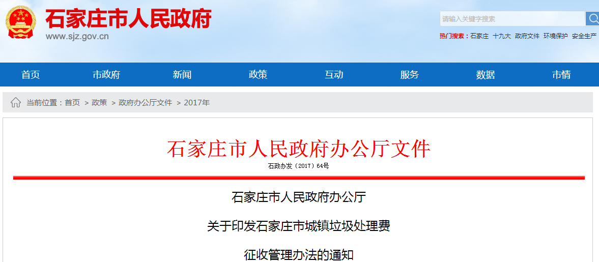 近日,在石家莊市人民政府辦公廳獲悉關(guān)于印發(fā)石家莊市城鎮(zhèn)垃圾處理費(fèi)征收管理辦法的通知,全文如下: