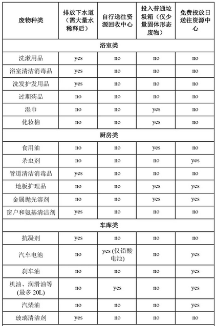 家庭危險廢物包括漂白劑、花園和泳池用化學(xué)品、油漆、溶劑等。居民可打電話給市政部門上門收集,或包裝好送往資源處理中心,但處理都會收費。每年每個區(qū)域(類似我們的街道)都會有兩三次免費日,在這幾天送危險廢物將不收費。由于危險廢物種類繁多,為了便于居民區(qū)分這類廢物與其它廢物,市議會有詳細的垃圾投放指導(dǎo),如表2所示。