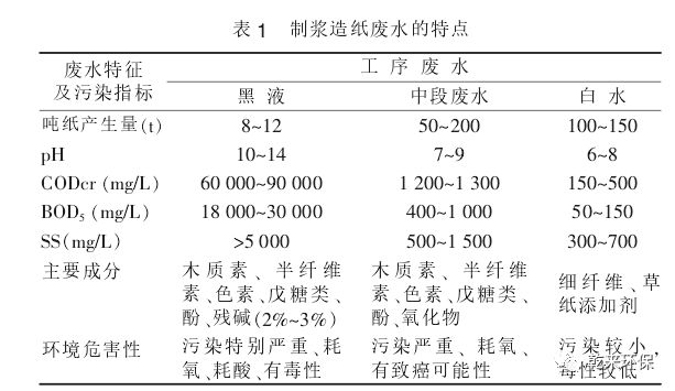 造紙廢水產(chǎn)生與生產(chǎn)過程的各個工序有關(guān),總的來說可以分為黑液、中段廢水與白水三類,其成分、產(chǎn)生量及水質(zhì)特征列于表1
