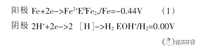 電極反應(yīng)產(chǎn)物具有高的化學(xué)活性,其中新生態(tài)的〔H〕和Fe2+能與廢水中的許多組分發(fā)生氧化還原作用,破壞廢水的發(fā)色或助色基團,失去發(fā)色能力;使大分子物質(zhì)分解為小分子物質(zhì)使難生物降解的物質(zhì)轉(zhuǎn)變成容易生物降解的物質(zhì),提高廢水的可生化性。在陰極,當(dāng)電解質(zhì)溶液(廢水)中有去極劑存在時,則有