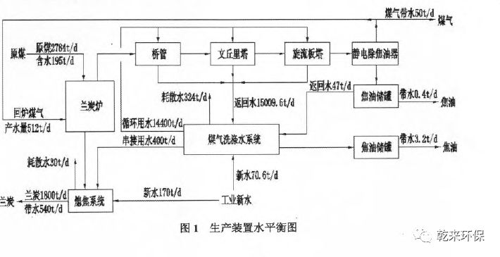 由圖1可知,60萬t/a蘭炭生產(chǎn)裝置是無盈水系統(tǒng)。系統(tǒng)中耗散水量比較大,一部分是蒸發(fā)、飛散等原因而耗散,另一部分是熄焦后由蘭炭吸附而耗散。這部分中蘭炭吸附耗散水來自煤氣洗滌水系統(tǒng)(即串接用水,煤氣洗滌水系統(tǒng)中部分被熄焦系統(tǒng)利用的水),含有大量煤焦油、酚、氨類等物質(zhì),在蘭炭生產(chǎn)區(qū),運輸區(qū)及使用地區(qū)分別造成不同程度的污染。因此,這部分串接用水急需經(jīng)濟、環(huán)保的工藝進行處理。蘭炭生產(chǎn)廢水分析指標:COD 40000-50000 mg/L;石油類2000--3500 mg/L;NH3-N 2000,-,4000mg/L;揮發(fā)酚2000-4000 mg/L;總酚8000--14000 mg/L;懸浮物1000 mg/L;硫化物200 mg/L;氰化物10mg/L;pH6--9。