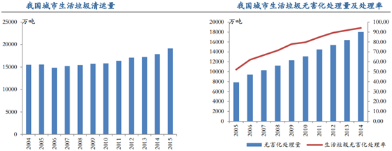 智通財經(jīng)APP了解到,2015年全國城市生活垃圾清運量為1.92億噸,過去十年的年均復合增長率為2.11%;其中城市生活垃圾的無害化處理率由2005年的52%提高至2015年的94%,復合增長率達到8.38%。但是市轄區(qū)農(nóng)村部分的無害化處理率僅為62.02%,且人均生活垃圾清運量已經(jīng)達到1.12千克,處于較高水平,垃圾處理的需求仍有較大空間。