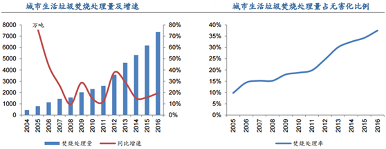 從近十年的發(fā)展態(tài)勢來看,國內(nèi)垃圾焚燒處理增長迅猛,從2005年的791萬噸增長至2015年的6175萬噸,年均復合增長率達到22.81%以上,焚燒率也由2005年的9.83%增長至2015年的34.28%,因此焚燒法將成為未來主流的垃圾處理方式。