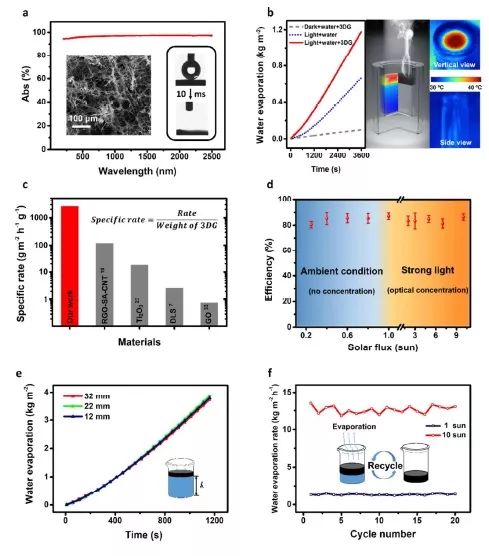 (f) 3DG在1 kWm -2和10 kWm -2太陽能照射下重復(fù)使用20次的圖像。