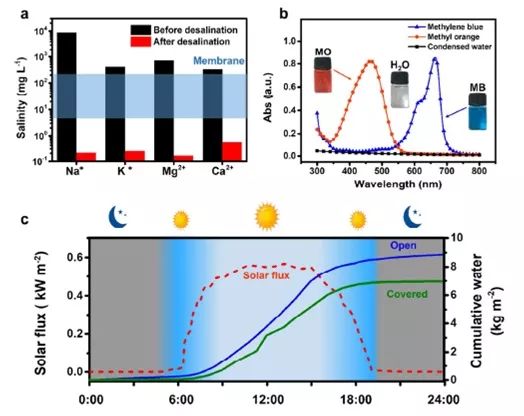 (c) 24小時持續(xù)測量太陽通量和清潔水的生成圖像。記錄一整天(0:00-24:00)的環(huán)境太陽通量(紅線),使用開放設(shè)備產(chǎn)生的蒸汽量(藍(lán)線)和使用覆蓋設(shè)備的冷凝水(綠線)。
