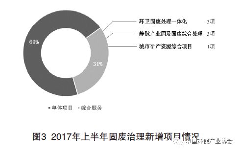 從2017年上半年環(huán)保上市公司披露的項目來看,42個固廢處理項目中,35個單體項目,投資總額97億元;7個綜合項目投資總額43億元。其中,環(huán)衛(wèi)固廢處理一體化項目3個,固廢綜合處理及靜脈產業(yè)園建設3個。以中國天楹中標的寧夏固原市循環(huán)經濟產業(yè)園及環(huán)衛(wèi)一 體化項目為例,該項目披露總投資15億元,包含生活垃圾焚燒發(fā)電BOT項目(30年)、餐廚垃圾處置BOT項目(30年)、污泥干化BOT項目(30年)、建筑垃圾循環(huán)利用項目(30年)以及城鄉(xiāng)環(huán)衛(wèi)一體化項目(30年)。 2017年上半年固廢治理新增項目情況如圖3。