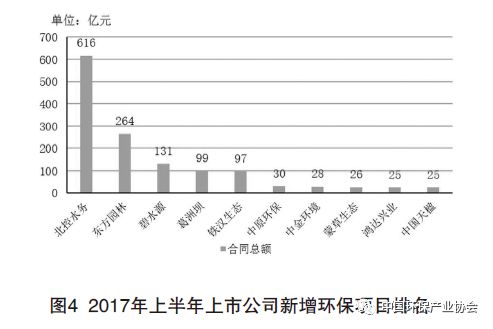在政策和資本推動下,環(huán)保產業(yè)迅猛發(fā)展,環(huán)保企業(yè)規(guī)模逐漸壯大,拿單能力不斷提升。根據咨詢公司從公開渠道的資料統(tǒng)計,上半年上市公司披露的環(huán)保項目中,北控水務簽約中標環(huán)保項目15個,投資總額616億元(聯(lián)合體項目由于內部投資額分配情況不明,因此按牽頭人統(tǒng)計,例如去年中標今年簽約的4個北京市通州區(qū)水環(huán)境治理項目總投資280億元,北控水務為牽頭人,則全部計入北控水務投資),其次,東方園林、碧水源等公司也獲得超過百億元的新增項目,拿單能力分化趨勢凸顯。2017年上半年上市公司新增環(huán)保項目排名見圖4。