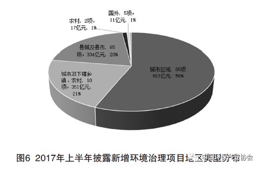 “十二五”以來重點地區(qū)環(huán)境污染治理項目快速推進,特別是重點中心城市環(huán)保市場日趨飽和,環(huán)境治理項目正逐漸轉向中小城鎮(zhèn)及部分農村地區(qū)拓展。2017年上半年城市環(huán)境治理項目仍占主體地位,投資總額923億元,占披露總額的56%。此外,約有351億元的項目為城區(qū)與下轄鄉(xiāng)鎮(zhèn)、農村的打包環(huán)境治理項目??h城及縣級市環(huán)境治理、農村環(huán)境治理項目數量已經相當可觀,投資總額達到披露總額的21%,但以單體項目為主,平均投資規(guī)模偏小。