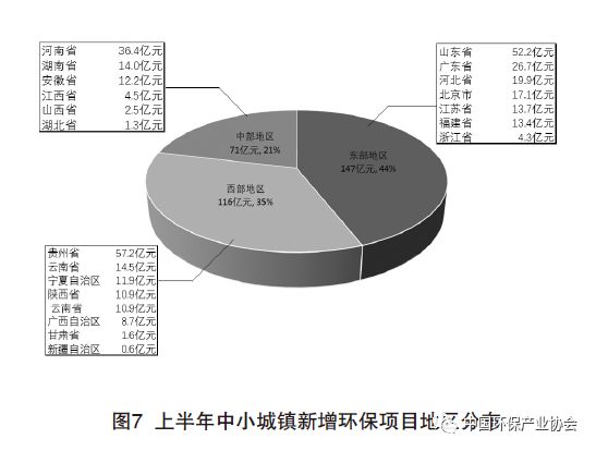 從地域分布來看,貴州、山東、河南、廣東等省市中小城鎮(zhèn)環(huán)保項目總投資額較大。總體來看,東部地區(qū) 中小城鎮(zhèn)環(huán)保市場活躍,投資額占比超過44.1%,中部地區(qū)占比21.2%,西部地區(qū)占比34.8%。2017年上半年中小城鎮(zhèn)新增環(huán)保項目地區(qū)分布見圖7。