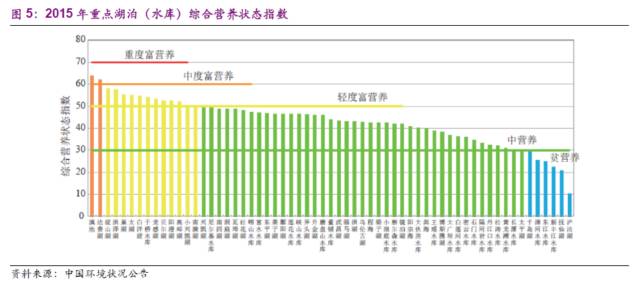 湖泊是重要的地表水資源,與人類的生活息息相關(guān),富營養(yǎng)化不可忽視。2015年,開展?fàn)I養(yǎng)狀態(tài)監(jiān)測的61個(gè)湖泊(水庫)中,貧營養(yǎng)的6個(gè);中營養(yǎng)的41個(gè),輕度富營養(yǎng)的12個(gè),中度富營養(yǎng)的2個(gè)。