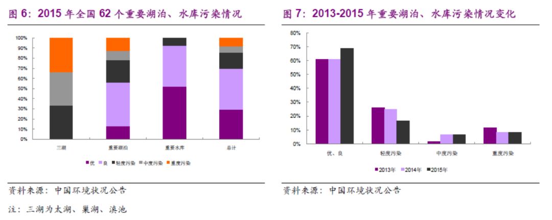 根據(jù)2015年中國環(huán)境狀況公告,“三湖”即太湖、巢湖、滇池均有不同程度的污染。重要湖泊(32個(gè)),污染比例逾30%,重點(diǎn)水庫水質(zhì)情況較好。而根據(jù)2013-2015年數(shù)據(jù)比較,污染情況改善依然不明顯。(注:優(yōu)為Ⅰ類和Ⅱ類水質(zhì),良好為Ⅲ類水質(zhì),輕度污染為Ⅳ類水質(zhì),中度污染為Ⅴ類水質(zhì),重度污染為劣Ⅴ類水質(zhì)。)
