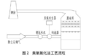 臭氧氧化法作為一種氧化脫氮方法,通常在脫硫塔前端的一段煙道注入臭氧,在均流器的作用下,使燒結(jié)煙氣中的NOx與臭氧充分接觸,并將NOx氧化成最高價(jià)態(tài),在后置的脫硫裝置內(nèi)與堿液發(fā)生反應(yīng),最終生成硝酸鹽,從而脫出煙氣中的NOx。工藝流程如圖2所示。其化學(xué)反應(yīng)式如下:O3+NO=NO2+O2;O2+2NO2=2NO3;NO2+NO3=N2O5;N2O5+H2O=2HNO3。