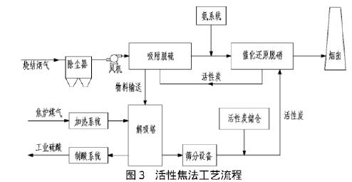 一體化脫硫脫硝技術(shù)已逐漸成為煙氣凈化工藝的一個(gè)重要選擇。目前研究較為廣泛并具有實(shí)用價(jià)值的聯(lián)合脫硫脫硝技術(shù)主要有活性焦法、SNRB、電子束法等。在燒結(jié)煙氣凈化上獲得較為廣泛認(rèn)可的只有活性焦法,其工藝流程如圖3所示。