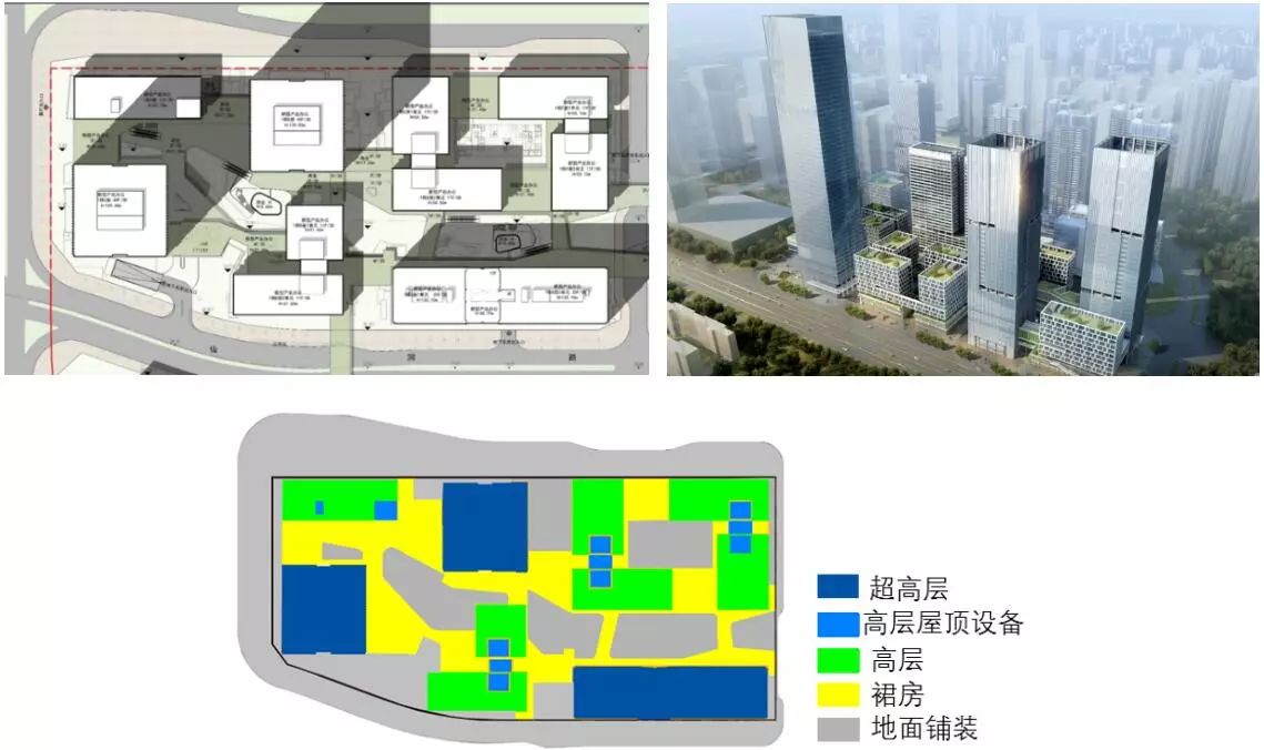 根據(jù)《留仙洞總部基地控制性詳細(xì)規(guī)劃》,規(guī)劃地塊屬于一街坊。規(guī)劃開發(fā)建筑面積為100萬平方米,凈容積率7.0-9.1。以物聯(lián)網(wǎng)、移動互聯(lián)網(wǎng)為主導(dǎo)產(chǎn)業(yè)。規(guī)劃地塊用地類型為M0,用地面積39352平方米。建筑方案主要由三座塔樓(超高層)、四座裙樓(高層)及連廊組成,屬于典型高密度開發(fā),綠地面積僅有2162平方米。