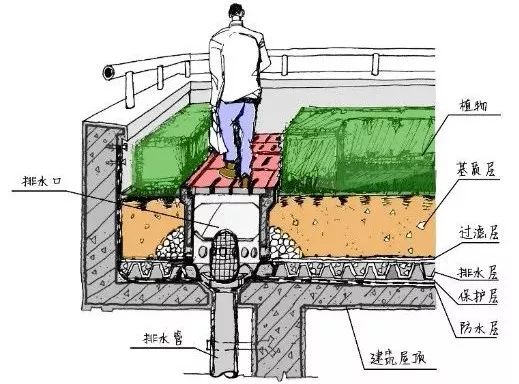 高密度開發(fā)區(qū)往往設(shè)計有裙樓及聯(lián)通塔樓之間的連廊,此處宜采用綠色屋頂形式來減少屋面徑流總量和徑流污染負(fù)荷,綠色屋頂又分為簡單式和花園式,基質(zhì)深度根據(jù)植物需求及屋頂荷載確定,簡單式綠色屋頂?shù)幕|(zhì)深度一般不大于150mm,花園式綠色屋頂在種植喬木時基質(zhì)深度可超過600mm,綠色屋頂?shù)脑O(shè)計可參考《種植屋面工程技術(shù)規(guī)程》(JGJ155)。