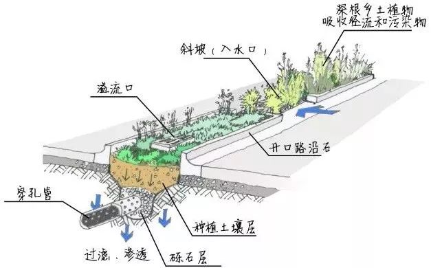 為充分利用高密度開發(fā)區(qū)的綠地空間,宜結(jié)合景觀,在地塊的匯水低點處設(shè)施復(fù)雜型雨水花園。雨水花園面積與匯水面面積之比一般為5%-10%。建議下沉高度為200-300mm,并應(yīng)設(shè)100mm的超高,且應(yīng)設(shè)置溢流設(shè)施。