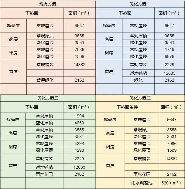 在現(xiàn)有方案基礎(chǔ)上優(yōu)化設(shè)計:首層地面鋪裝不做處理;首層地面綠化全部進行下沉式改造;裙房以及高層屋頂綠化比例維持不變;設(shè)置520m3的調(diào)蓄池。
