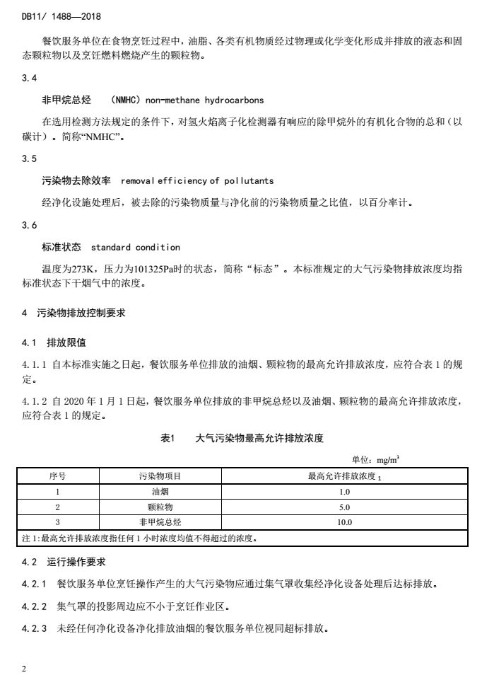 標(biāo)準(zhǔn)規(guī)定了餐飲服務(wù)單位排放的油煙、顆粒物和非甲烷總烴(注:“非甲烷總烴”為表征“揮發(fā)性有機物”,簡稱“VOCs”的一種指標(biāo))三項污染物的排放限值,明確了三項污染物的監(jiān)測要求和分析測定方法,提出了凈化設(shè)備的運行操作要求,從而全面控制餐飲業(yè)的大氣污染排放。該標(biāo)準(zhǔn)于2018年1月8日發(fā)布,并將于2019年1月1日起實施,其中油煙和顆粒物限值自標(biāo)準(zhǔn)實施之日起執(zhí)行,非甲烷總烴限值自2020年1月1日起執(zhí)行。
