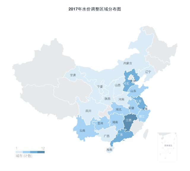 2017年發(fā)生水價(jià)調(diào)整的縣市共計(jì)87個(gè),涉及24個(gè)省份。主要集中在中部地區(qū),其中江西省多達(dá)12個(gè)縣市發(fā)生水價(jià)調(diào)整。