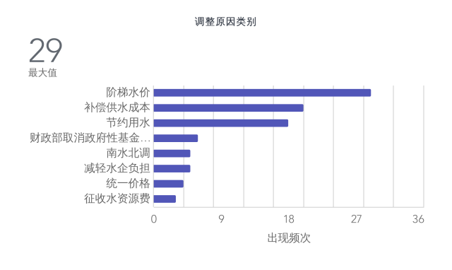 在調(diào)整水價(jià)的原因中,有29個(gè)縣市是為了執(zhí)行階梯水價(jià)而進(jìn)行水價(jià)調(diào)整。另外補(bǔ)償供水成本,節(jié)約用水也是水價(jià)調(diào)整的主要原因。