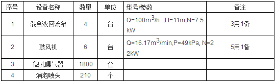 設(shè)計(jì)A /O 池二座,尺寸為39.0m ×18.0m×6m ,在長(zhǎng)度方向上分為4個(gè)串聯(lián)的廊道,每個(gè)廊道寬5m ,有效水深為5m 。前兩個(gè)廊道為A 段,每段設(shè)置潛水推進(jìn)器一臺(tái),并設(shè)置微孔曝氣器以增強(qiáng)對(duì)廢水的攪拌,防止大量污泥沉積。后兩個(gè)廊道為O 段,通過鼓風(fēng)機(jī)和微孔曝氣器向池內(nèi)供氧。A 段主要設(shè)備:潛水推進(jìn)器:4臺(tái);微孔曝氣器1000個(gè)。O 池采用鼓風(fēng)微孔曝氣。為抑制曝氣池中泡沫的產(chǎn)生,沿曝氣池隔墻表面布設(shè)有消泡水管。O 段主要設(shè)備如下表。