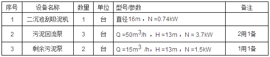 中心進(jìn)水的輻流式沉淀池一座,二沉池直徑16m ,總高4.4m ,超高0.5m ,鋼筋混凝土結(jié)構(gòu)。內(nèi)設(shè)刮吸泥機(jī)1臺(tái),功率1.87kW 。二沉池的底泥通過刮吸泥機(jī)進(jìn)入集泥井,集泥井尺寸為4.5m×3.0m×5.9m。主要設(shè)備如下表。
