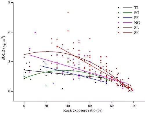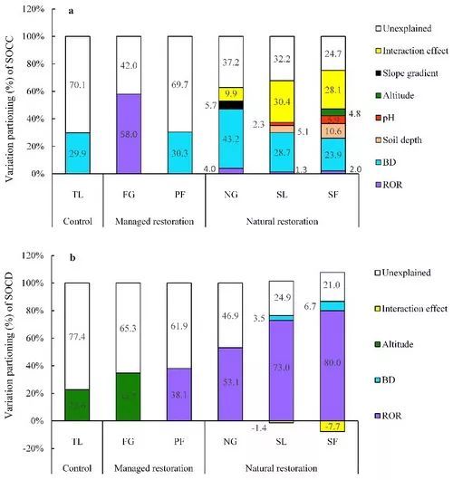 針對(duì)這一科學(xué)問(wèn)題,在王克林和張偉指導(dǎo)下,研究組以耕地為對(duì)照,通過(guò)分析人工恢復(fù)方式(人工牧草、人工經(jīng)濟(jì)林)和自然恢復(fù)方式(撂荒草地、灌木林、次生林)下土壤有機(jī)碳變化特征并記錄相應(yīng)的環(huán)境因子信息,解析了不同恢復(fù)模式(人工恢復(fù)和自然恢復(fù))土壤有機(jī)碳積累變化規(guī)律,并揭示了其相應(yīng)的環(huán)境驅(qū)動(dòng)因子。研究發(fā)現(xiàn),自然恢復(fù)模式土壤有機(jī)碳含量顯著高于人工恢復(fù)模式和耕地,而短期內(nèi)(9年)人工恢復(fù)模式和耕地之間有機(jī)碳含量無(wú)顯著差異。不考慮基巖出露對(duì)土壤有機(jī)碳儲(chǔ)量影響,各植被類(lèi)型之間有機(jī)碳儲(chǔ)量無(wú)顯著差異,剔除基巖出露影響后,自然恢復(fù)植被下有機(jī)碳儲(chǔ)量顯著高于人工恢復(fù)植被和耕地。方差分解表明,人工恢復(fù)方式下土壤有機(jī)碳含量和儲(chǔ)量?jī)H部分變異受環(huán)境因子(如基巖出露率、土壤容重、海拔)影響;而在自然恢復(fù)方式下,環(huán)境因子能有效解釋有機(jī)碳含量和儲(chǔ)量的大部分變異,且隨著植被正向演替解釋量逐漸增加,但有機(jī)碳含量和儲(chǔ)量的環(huán)境驅(qū)動(dòng)因子并不相同,前者受多個(gè)環(huán)境因子共同驅(qū)動(dòng)(如土壤容重、基巖出露率、土層深度、pH等),后者則主要受基巖出露率驅(qū)動(dòng)。基于對(duì)不同恢復(fù)模式下有機(jī)碳含量和儲(chǔ)量變化分析及其環(huán)境驅(qū)動(dòng)因子評(píng)估結(jié)果表明,相比人工恢復(fù)模式,短期內(nèi)自然恢復(fù)更有利于土壤碳固持,且上述環(huán)境因子可作為評(píng)估自然恢復(fù)模式下土壤碳庫(kù)變化的重要指標(biāo)。