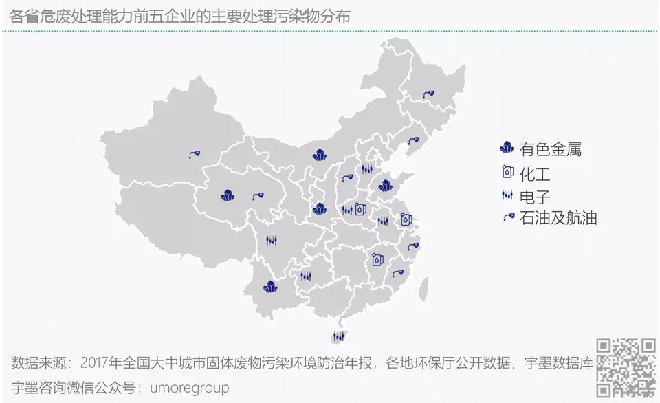而由于產(chǎn)業(yè)聚集,也存在相應(yīng)的問題,那就是各地的污染物也有著明顯的區(qū)別,無法簡單地用統(tǒng)一標(biāo)準(zhǔn)進行合理處置。因此長期以來,我國的危廢行業(yè)都有著區(qū)域壁壘高的特點,且隨著國家對于跨省運輸危廢要求的提高,這種區(qū)域性就更為明顯。如果我們把各省份危廢處理資質(zhì)的Top5列出來,也可以發(fā)現(xiàn)幾乎每個省份的主要危廢龍頭所從事的領(lǐng)域都與當(dāng)?shù)氐漠a(chǎn)業(yè)特點相呼應(yīng),這也進一步驗證了危廢處置存在明顯的區(qū)域性。