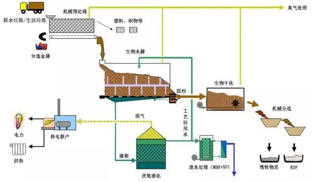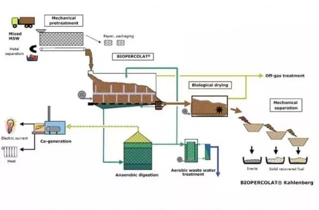 工藝全過程分為四個階段:機械預(yù)處理、淋濾處理 – 整個處理過程的核心步驟、生物干化、機械分選和 RDF 生產(chǎn)。