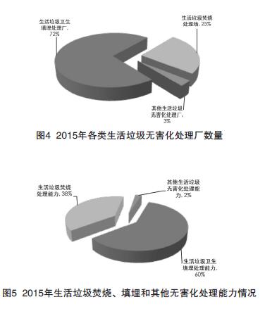 2015年,我國生活垃圾清運(yùn)量1.9億噸,無害化處理量為1.8億噸,其中包括衛(wèi)生填埋量1.15億噸,焚燒量0.62億噸和其他無害化處理量0.04億噸(見圖3)。2015年生活垃圾無害化處理率達(dá)到94.1%。目前,國內(nèi)有890座生活垃圾無害化處理廠,其中生活垃圾衛(wèi)生填埋場640座,生活垃圾焚燒廠22座,其他生活垃圾無害化處理廠30座(見圖4)。生活垃圾無害化處理能力為57.64萬噸/日,其中衛(wèi)生填埋處理能力34.4萬噸/日,焚燒處理能力21.9萬噸/日,其他無害化處理能力1.34萬噸/日(見圖5)。