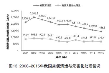 2015年,國內(nèi)有機(jī)廢物的產(chǎn)生量約42億噸,其中畜禽糞便排放量約32億噸,農(nóng)作物秸稈產(chǎn)生量約9億噸。根據(jù)中國環(huán)境統(tǒng)計年鑒,2015年全國糞便清運(yùn)量1436.8萬噸,糞便無害化處理量673.7萬噸。從2006年到2015年,國內(nèi)的糞便清運(yùn)量和無害化處理量均有不同幅度下降(見圖13)。