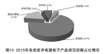 2015年,共有29個省份的106家企業(yè)實際開展了廢棄電器電子產(chǎn)品拆解處理活動,拆解處理總量達(dá)7625.4萬臺,同比增長8.2%。各類廢棄電器電子產(chǎn)品中,電視機(jī)拆解5309.8萬臺,占比9.6%,同比下降7.9%;電冰箱拆解333.2萬臺,占比4.4%,同比增長110.9%;洗衣機(jī)拆解636.1萬臺,占比8.3%,同比增長93.9%;房間空調(diào)器拆解18.5萬臺,占比0.2%,同比增長3.5%;微型計算機(jī)拆解1327.9萬臺,占比17.4%,同比增長69.2%。2015年各類廢棄電器電子產(chǎn)品規(guī)范拆解占比情況見圖14。