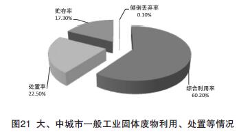 根據(jù)環(huán)境保護(hù)部發(fā)布的《2016年全國大、中城市固體廢物污染環(huán)境防治年報》,2015年,246個大、中城市一般工業(yè)固體廢物產(chǎn)生量達(dá)19.1億噸,其中,綜合利用量11.8億噸、處置量4.4億噸、貯存量3.4億噸、傾倒丟棄量17.0萬噸。一般工業(yè)固體廢物綜合利用量占利用處置總量的60.2%,處置和貯存分別占比22.5%和17.3%,綜合利用仍然是處理一般工業(yè)固體廢物的主要途,部分城市對歷史堆存的固體廢物進(jìn)行了有效的利用和處置(部分城市一般工業(yè)固體廢物利用量包含了對往年貯存量的利用)。一般工業(yè)固體廢物利用、處置等情況見圖21。