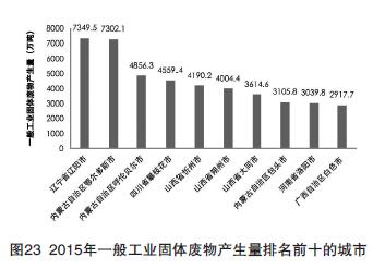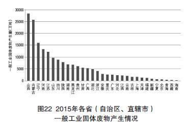 2015年各?。▍^(qū)、市)大、中城市發(fā)布的一般工業(yè)固體廢物產(chǎn)生情況見圖22。一般工業(yè)固體廢物產(chǎn)生量排在前三位的省是山西、內(nèi)蒙古、遼寧。
