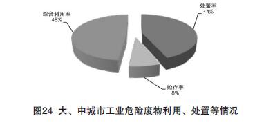 2015年,246個大、中城市工業(yè)危險廢物產(chǎn)生量達(dá)2801.8萬噸,其中,綜合利用量1372.7萬噸、處置量1254.3萬噸、貯存量216.7萬噸。工業(yè)危險廢物綜合利用量占利用處置總量的48.3%,處置、貯存分別占比44.1%和7.6%,有效利用和處置是處理工業(yè)危險廢物的主要途徑,部分城市對歷史堆存的危險廢物進(jìn)行了有效利用和處置(部分城市危險廢物利用量包含了對往年貯存量的利用)。工業(yè)危險廢物利用、處置等情況見圖24。