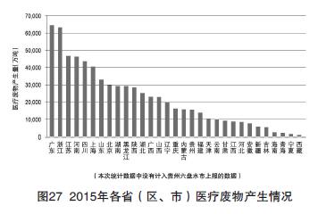 2015年,246個大、中城市醫(yī)療廢物產(chǎn)生量69.7萬噸、處置量69.5萬噸,大部分城市的醫(yī)療廢物處置率都達(dá)到了100%。各?。▍^(qū)、市)發(fā)布的大、中城市醫(yī)療廢物產(chǎn)生情況見圖27。醫(yī)療廢物產(chǎn)生量排在前三位的省份是廣東、浙江、江蘇。