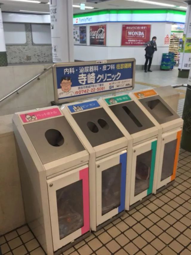 此外,垃圾分類的制度也在公共場(chǎng)合得到嚴(yán)格執(zhí)行,首先最為顯著的特點(diǎn)是,一般的大街小巷是看不到垃圾桶的,只有在一些人流集中的公共場(chǎng)所才會(huì)有垃圾桶,并進(jìn)行垃圾分類。譬如在地鐵車站,垃圾共分為4類,分別是廢紙、塑料、瓶子以及其他(應(yīng)該是果皮等),又譬如在奈良的著名景點(diǎn),包括東大寺、春日神社、博物館等地方也都可以看到類似的分類,只不過(guò),有的垃圾桶上有非常明顯的顏色加以區(qū)別,有的則只是用圖案來(lái)表示??傮w上,由于人口的流動(dòng)性,公共場(chǎng)所的垃圾分類可能并沒(méi)有社區(qū)執(zhí)行地那么好,但基于我們對(duì)日本嚴(yán)格垃圾分類制度的耳聞,在扔棄垃圾時(shí)總是會(huì)小心翼翼地,怕扔錯(cuò)了地方,這樣一來(lái),還是可以大大提高分類的有效性。
