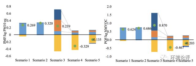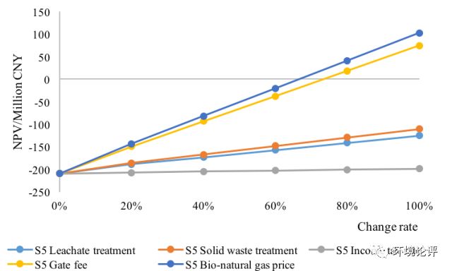 注:情景1-填埋+填埋氣發(fā)電;情景2-填埋+填埋氣提純;情景3-焚燒發(fā)電;情景4-機(jī)械生物處理+沼氣發(fā)電;情景5-機(jī)械生物處理+沼氣提純。下同。