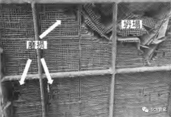 高溫煙氣攜帶大量顆粒物進入SCR反應器與催化劑發(fā)生碰撞,在“馬格努斯效應”下將使催化劑壁厚逐漸減小而造成磨損,甚至導致催化劑的坍塌,如圖1所示。催化劑磨損與流場分、煙氣特性、飛灰特性等因素有關。