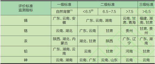 注:(1):一級標準體現(xiàn)土壤自然背景值,不區(qū)分土壤pH值;(2):二級標準按土壤pH值不同區(qū)分,三級標準pH值大于6.5。