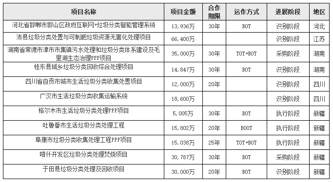 根據(jù)財政部入庫項目不完全統(tǒng)計,涉及垃圾分類的PPP項目如下: