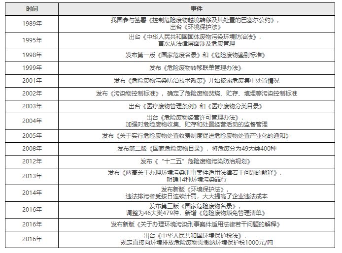 隨著危廢相關禁令和政策密集出爐,危廢治理市場熱度逐漸提升。我國政府對危廢處置行業(yè)高度重視,迄今已形成以《國家危險廢物名錄》為核心,覆蓋從危廢鑒別、轉移、處置到資質(zhì)、監(jiān)管的危廢治理法規(guī)體系。