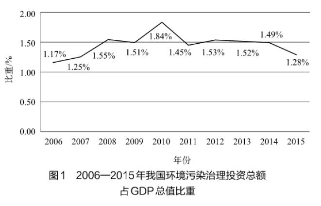 我國環(huán)保投資水平大大低于發(fā)達國家。發(fā)達國家的經(jīng)驗是:當一個國家的環(huán)保投資占GDP比例在1%~2%時,至多只能防止環(huán)境狀況的進一步惡化;而要使環(huán)境質量發(fā)生明顯的好轉,環(huán)保投資額要占到同期GDP的3%~5%。2011年英國環(huán)保投資占GDP比重為5.28%,法國為5.27%,意大利為3.14%,日本為6.17%。而我國環(huán)境污染治理投資額占GDP比重近十年來總體保持較低水平,基本為1.15%~1.85%,2010年之后甚至出現(xiàn)較明顯的下降,2015年環(huán)境污染治理投資占GDP比重降至1.28%,如圖1所示。