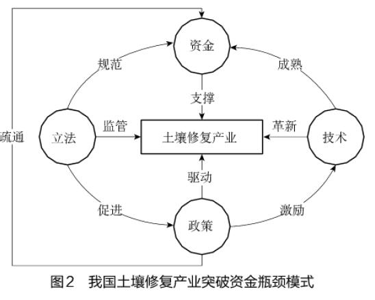 突破資金瓶頸需多方面的綜合對策。如圖2所示,既需要立法監(jiān)管修復產(chǎn)業(yè),明確責任主體,規(guī)范細化資金使用;又需要先進的技術革新修復產(chǎn)業(yè),進而成熟修復產(chǎn)業(yè)鏈,優(yōu)選廉價、安全、高效的修復技術以節(jié)省成本;還需要政策創(chuàng)新驅動修復產(chǎn)業(yè),疏通資金渠道。而立法、技術、政策對資金瓶頸問題的解決之間又不是相互孤立的,立法完善可以促進新政策的推出,新政策的發(fā)布實施又可以激勵企業(yè)開發(fā)新技術和市場融資創(chuàng)新。只有立法監(jiān)管、政策驅動、技術革新再加上資金支撐等全方面、多層次的推動,土壤修復產(chǎn)業(yè)才能迎來“土十條”頂層設計所描繪的真正“凈土”。