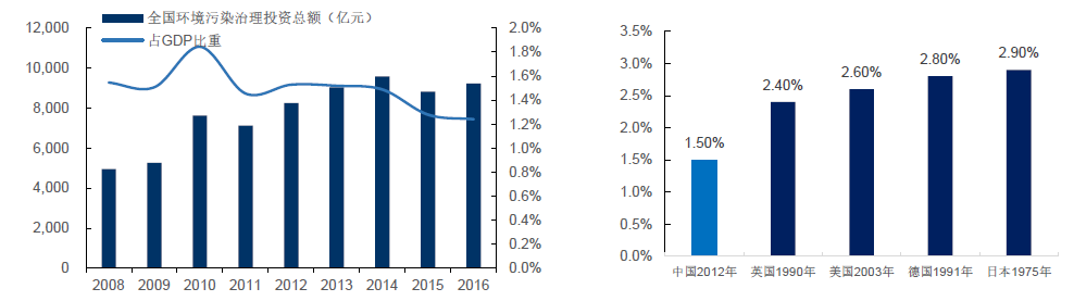 我國環(huán)境治理標(biāo)準(zhǔn)距國際先進標(biāo)準(zhǔn)差距大,我國環(huán)保污染治理投資總額占GDP比重為1.3%,與發(fā)達國家同期2.5%的投入還有較大差距。