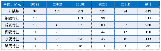 假設(shè)到2021 年底,全國所有地區(qū)非電行業(yè)均達到特別排放限值的要求,測算出以下幾個業(yè)大氣治理需求。