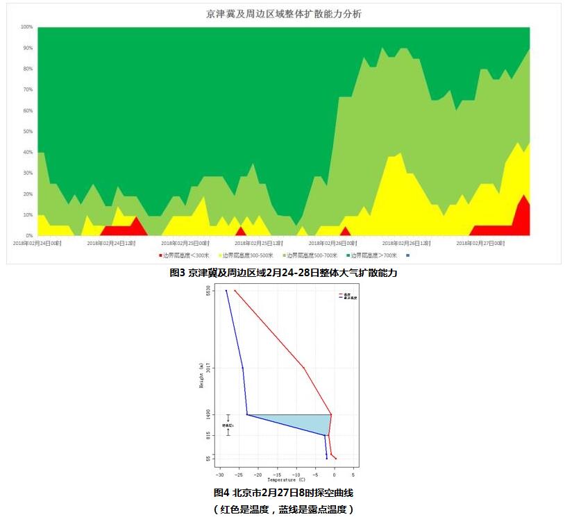 地基雷達(dá)觀測(cè)結(jié)果也顯示,京津冀及周邊地區(qū)大氣邊界層高度從2月25日以來總體持續(xù)下降,26日0時(shí)到27日0時(shí)邊界層高度低于700米的區(qū)域占比超過60-80%,邊界層高度低于500米的區(qū)域占比達(dá)10-30%,不利于大氣污染物擴(kuò)散(圖3)。北京探空資料顯示27日8時(shí)1400米以下有逆溫層,抑制污染物垂直擴(kuò)散。長時(shí)間的小風(fēng)、高濕疊加逆溫等不利氣象條件,導(dǎo)致污染不斷積累和二次轉(zhuǎn)化(圖4)。